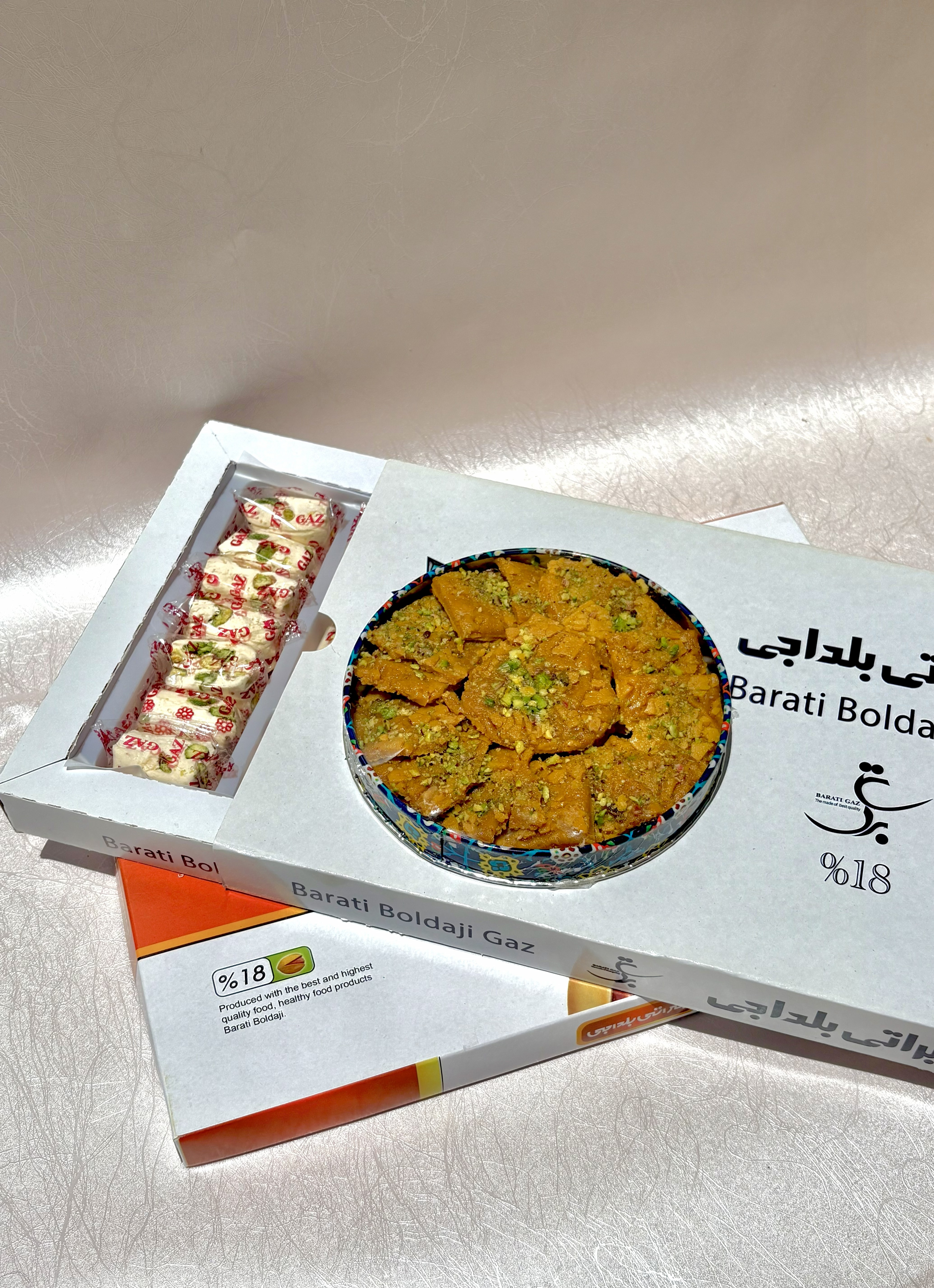 یک بسته گز ۱۸ درصد لقمه ای پسته، یک بسته گز ۱۸ درصد آردی، سوهان کره ای زعفرانی ۳۰۰ گرمی